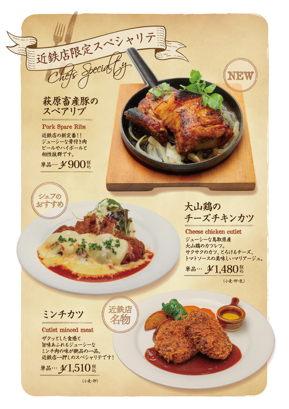 オーダーが通ってから、ひとつひとつ丁寧に焼き上げた東洋亭ハンバーグを中心にオムライスやカレー、ミンチカツ、エビフライといった洋食メニュー、ディナータイムは近鉄店オリジナルのお酒にあう小皿メニューを取りそろえております。一皿一皿にお客様への思いを込めて、美味しくてまた来たい、また食べたいと思っていただける料理を一生懸命作っています。ぜひこの機会にグリル&バー東洋亭近鉄店にお越しください。ロマンあふれるスタッフがお待ちしております!!